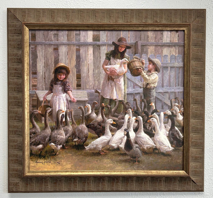“Growing up on the farm,” says Morgan Weistling,“I loved to feed the animals. This painting brings back childhood memories of my two sisters and myself. I love to paint geese because their natural design is so decorative. I named each goose as I painted it — I had Daisy, Lobelia, Bungo, Pippin, Eleanor and Hamfast — and had some fun painting Bingo, the lone duck, peering out at the viewer.”