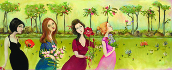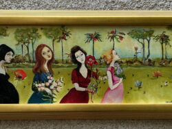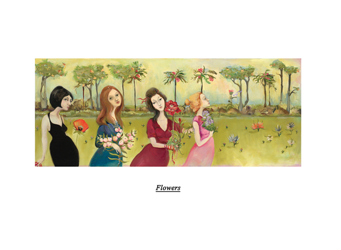 Poppy, a magical flower representing life over death, light and darkness. Camellia, delicate and elegant, it is a symbol of transience of life. Stock, everlasting beauty, it is a symbol of a happ life. Violets, represents humility, modesty and innocence.